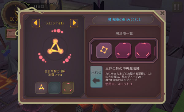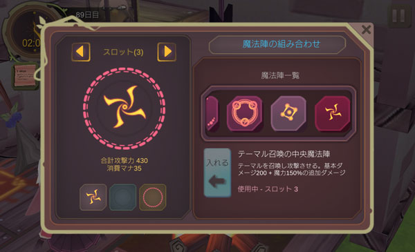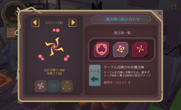 スロット3にはテーマルを召喚する魔法陣を組み込んでいます。強敵にはこの魔法を使用することになる。だけど威力430ってのは意外と低い。燃費を考慮すれば炎の魔法陣の方が安定しそうです。