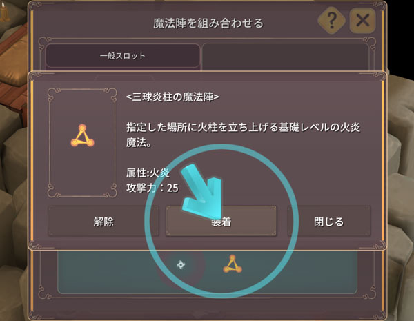 作成をした三球炎柱の魔法陣は『一般スロット』にセットしたらしい。他にもスロットの種類があるようですね。前作には無いシステムだ。