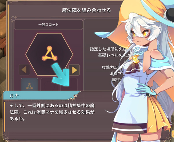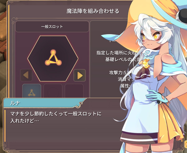 ダメージを大きくしたい時は『注力スロット』、マナを節約したい場合は『補助スロット』に入れろと教えてもらいました。マジかよ3種類のスロットを使い分けるのか。慣れるまでは難しそうだ。